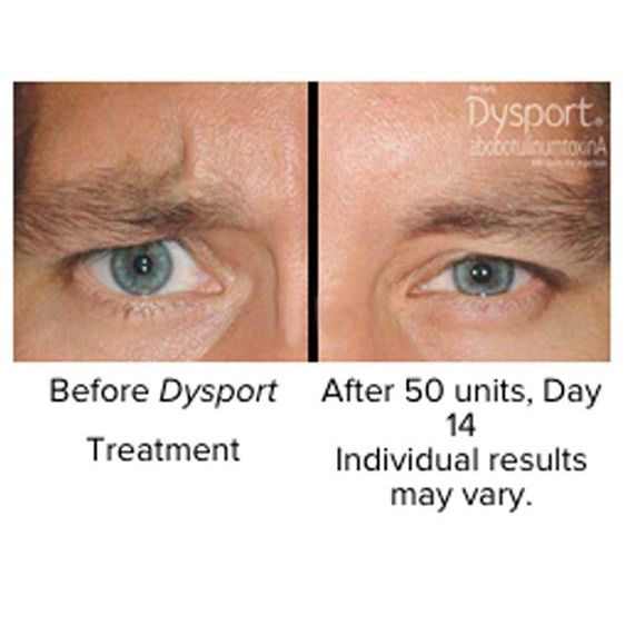 With just 1 injection into each of 5 points between and over the eyebrows, Dysport® blocks the signal from the nerve to the muscles, ultimately resulting in a reduction of muscle activity and temporarily preventing contraction of the muscles that cause frown lines.
